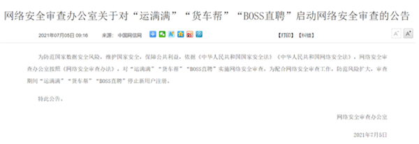 一天后,網絡安全審查辦公室發布關于對“運滿滿”“貨車幫”“BOSS直聘”啟動網絡安全審查的公告。