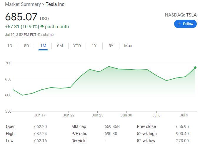 特斯拉盤中最高漲4.6%,股價(jià)至6月28日以來的兩周高位。