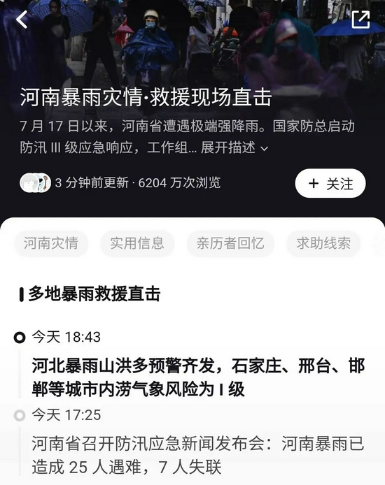 7月21日0點左右,知乎緊急上線“河南暴雨互助通道”,為用戶提供救援信息的交流平臺。