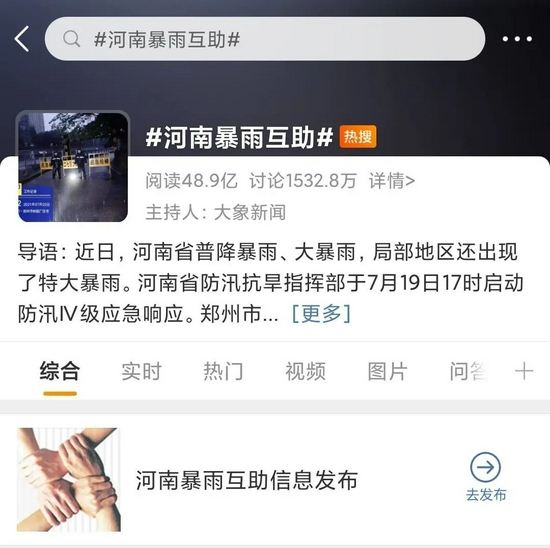 從7月20 日上午開始,微博熱搜一半以上為河南暴雨相關話題,1500多條求助信息通過微博發出。下午5點20分,微博開通#河南暴雨互助#通道,將其置頂在熱搜榜最上方,并接入相關超話和話題頁。話題中,受困人員或轉達者將所困地址、人數、現狀等系列情況發布,供外界傳播或聯系。