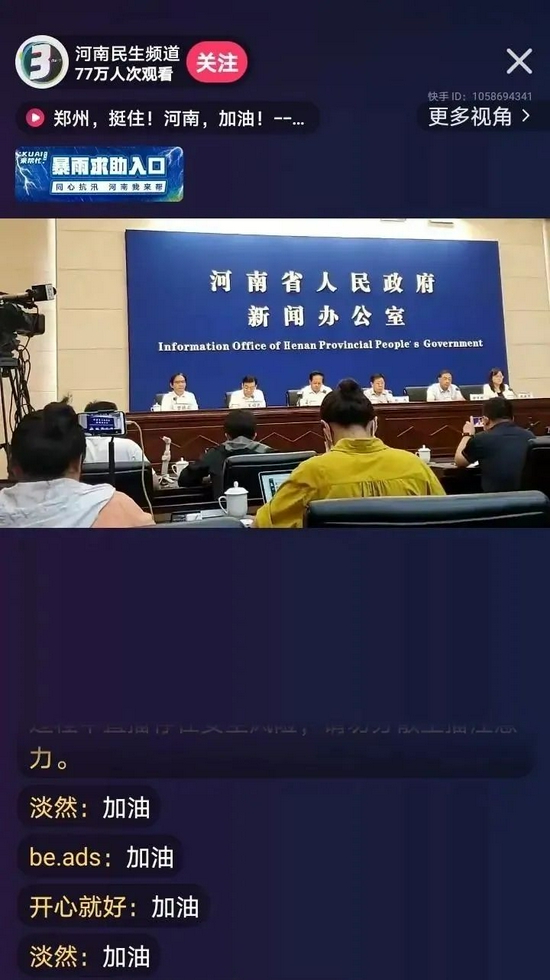 另一邊,快手也在災情初期上線了求助通道,以問卷形式收集求助信息。除了搜索河南暴雨相關信息會出現的“關注河南暴雨”專題欄目,快手還在央視網等多個官方媒體直播間的醒目位置掛上了“暴雨求助入口”直達鏈接,方便有需要的民眾及時同步求助信息。