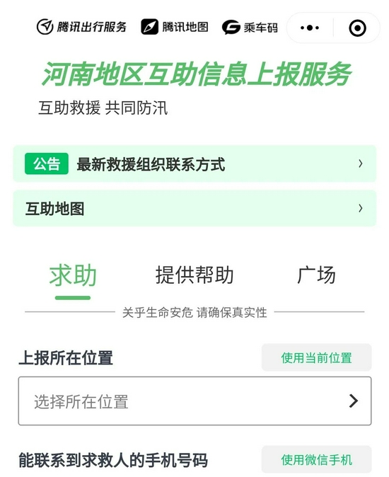 21日晚,騰訊出行服務聯合騰訊地圖、乘車碼上線河南汛情互助救援服務小程序。小程序中,當地民眾可以自行發布求助或提供幫助的信息,并在廣場界面瀏覽全部內容,簡潔的頁面讓救援工作得以更加高效地進行。