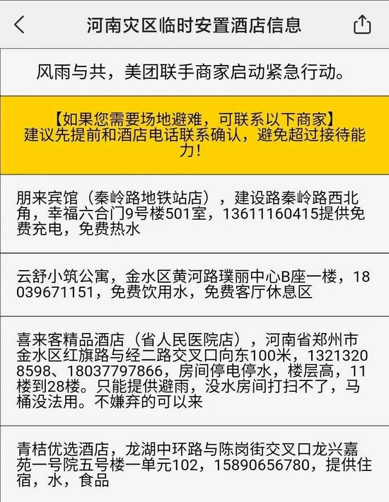美團近年來奮力發展的“共享充電寶”業務派上了用場。目前,美團已協調鄭州仍在有效工作中的所有充電寶機柜,用戶可以通過App或小程序查詢附近站點,免費充電。如果手機已經關機,受災群眾還可以通過機柜的應急充電線充電。