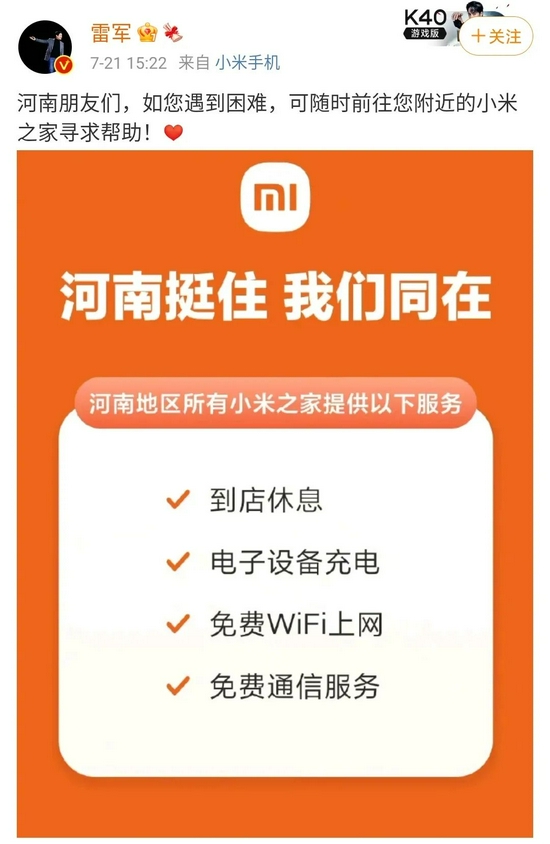 小米公益基金會捐款5000萬元,并緊急動員小米河南分公司員工參與當地救援行動,雷軍表示,河南地區所有小米之家為受災群眾提供休息、充電等服務;聯想捐款5000萬元,同時提供著IT設備修復、數據中心恢復等專業服務,在技術層面提供幫助;華為正努力維護與恢復災區通信,河南代表處的187名工程師投身一線,暴雨傾盆之下,面臨生命危險的技術人員們為救援行動“保駕護航”。