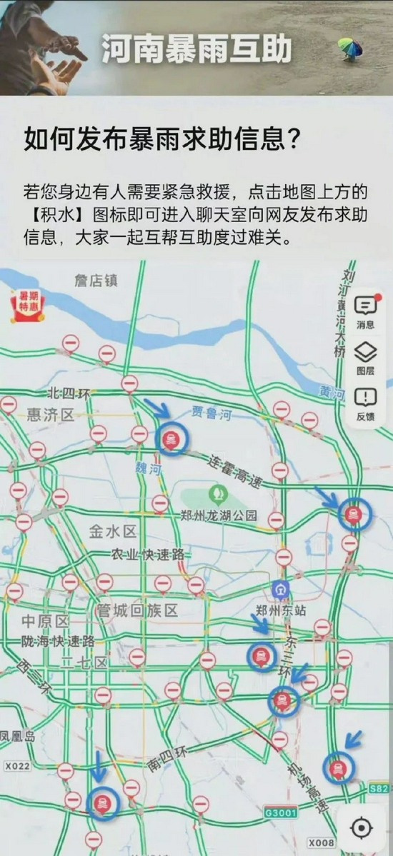 7月21日凌晨1時30分,高德地圖緊急上線河南暴雨信息互助通道功能。出現積水或者封路等道路交通事件時,互助通道便會自動開啟。
