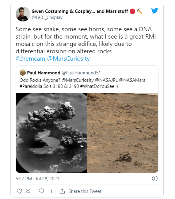 火星地質(zhì)學(xué)家 Gwénaël Caravaca 在 Twitter 上對這個拱門發(fā)表評論,說可以看到它像一條蛇、角或一個 DNA 菌株。
