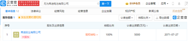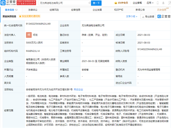 企查查 App 顯示,8 月 3 日,無為弗迪電池有限公司成立,法定代表人為何龍,注冊資本 5000 萬元人民幣,經營范圍包含:電池制造;電池銷售;新材料技術研發;電子專用材料制造;電子專用材料銷售;電子專用材料研發等。