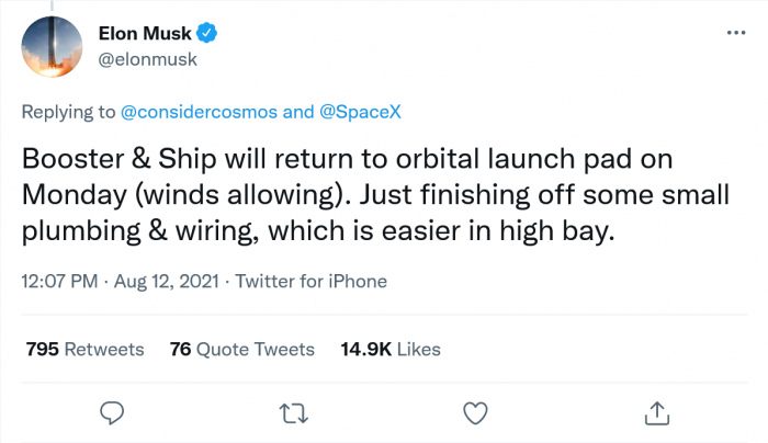 當地時間 8 月 12 日,SpaceX 將 Starship 20 從發射臺移走,但 Super Heavy Booster 4 仍在那里呆了幾天時間。據推測,由于強風,助推器仍在發射臺上。最近,SpaceX CEO 埃隆·馬斯克回復了一條推問,該推問顯示了本周早些時候 Super Heavy Booster 4 被帶回生產現場的視頻。馬斯克在推文上指出,助推器和星際飛船將在周一返回軌道發射臺,這取決于風向。
