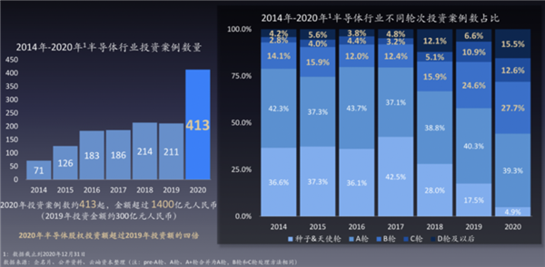 2020年半導(dǎo)體行業(yè)股權(quán)投資案例達(dá)413起,投資金額超過(guò)1400億元人民幣,與2019年300億投資額相比,增長(zhǎng)近4倍。