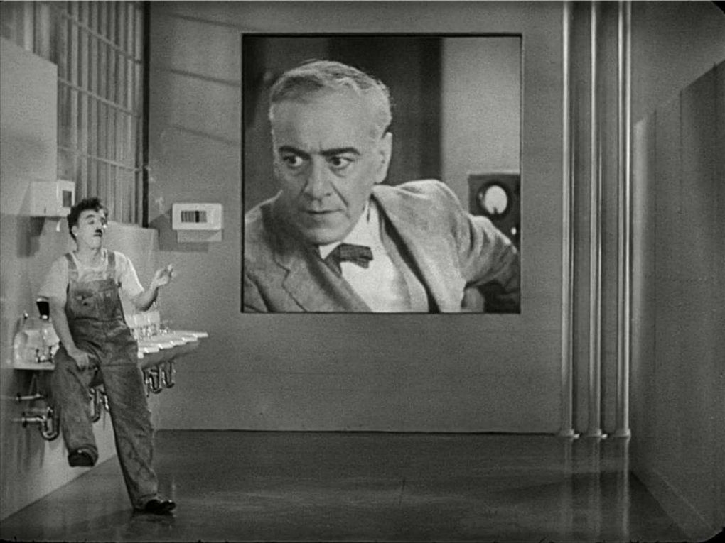 「休息時間,一名工人正在抽煙,而背后的電子屏幕上,老板的面孔突然出現(xiàn)并命令他回去繼續(xù)工作……」這是 1936 年上映的《摩登時代》中的場景。