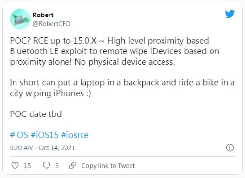 早前,一位安全研究人員發現并報告了一個遠程代碼執行漏洞,或允許攻擊者擦除所有 iOS 設備的漏洞。@RobertCFO 周三發推稱,其能夠利用這個可在近距離發起攻擊的低功耗藍牙漏洞,在無需訪問的情況下擦除受影響 iPhone 和 iPad 設備,且后續還會提供概念驗證演示。