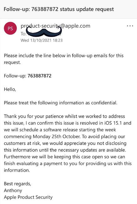 蘋果方面爽快承認了這個問題,并表示會在 iOS 15.1 中得到修復。同時要求 @RobertCFO 對郵件和漏洞利用細節保密,直到補丁正式推出。