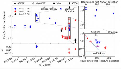 在 MeerKAT 探測之后,天文學家在X射線(使用尼爾-蓋爾斯-斯威夫特天文臺和錢德拉X射線天文臺)和紅外線(使用智利的雙子座望遠鏡)中尋找該源。然而,他們什么也沒看到。