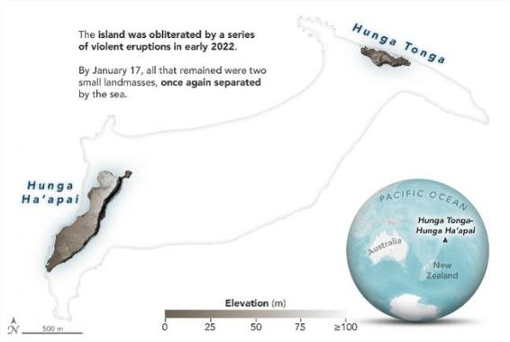NASA 地球觀測(cè)站的數(shù)字高程地圖也顯示了洪阿哈阿帕伊島發(fā)生的劇烈變化。在本月早些時(shí)候火山噴發(fā)前,兩個(gè)無人居住的島嶼被火山錐合并成一個(gè)新陸地。