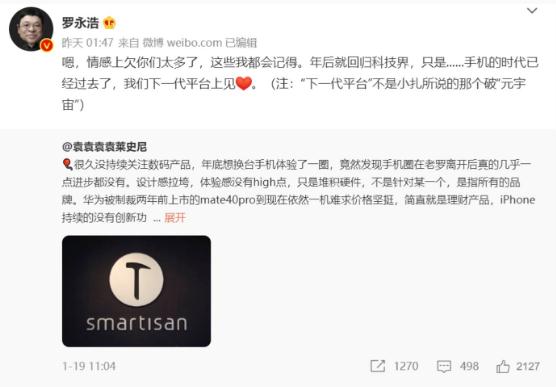 1 月 20 日凌晨,羅永浩在微博上轉發網友評論,并且再次預告自己年后將回歸科技界。