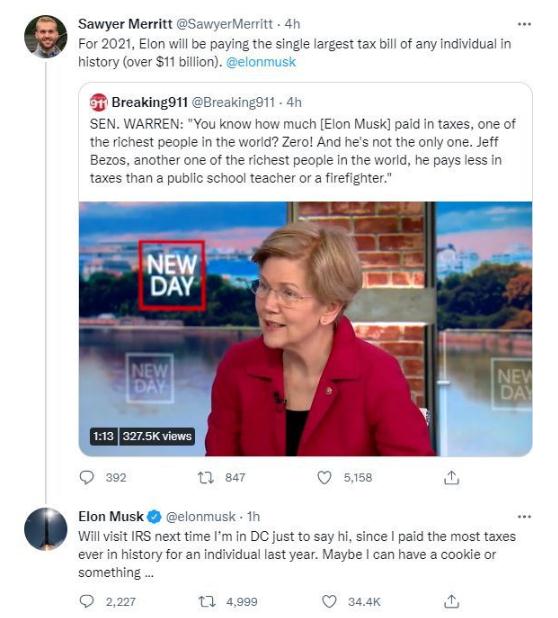 有網友在Twitter上發文表示,馬斯克在2021年繳稅超110億美元,創造歷史新高。