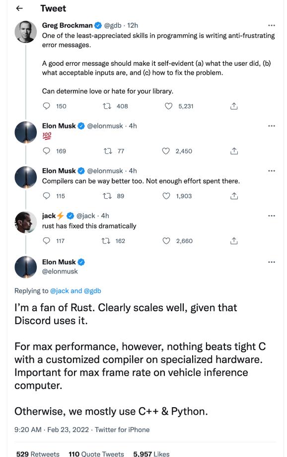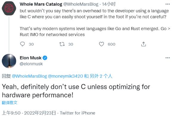 馬斯克回復稱,他也是 Rust 的粉絲,十分認可 Rust 的擴展性。不過為了獲得最大化的性能,最好的方案還是在專門的硬件上使用包含定制編譯器的 C 語言。這對汽車上的推斷計算機上的最大幀率 (max frame rate) 十分重要。其他場景他們主要使用 C++ 和 Python。他還強調道,除非需要針對硬件性能進行優化,否則絕對不要使用 C!