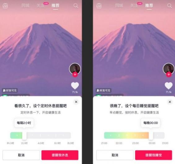 近日,抖音升級時間管理工具,加強對老年用戶的休息提醒。用戶可自行設置休息提醒和睡眠提醒時間,當到達約定時間后會收到風景紀錄片內容的提醒頁面。同時,針對老年用戶的認知行為特點,頁面中會出現語音播報,將提醒內容語音告知用戶。