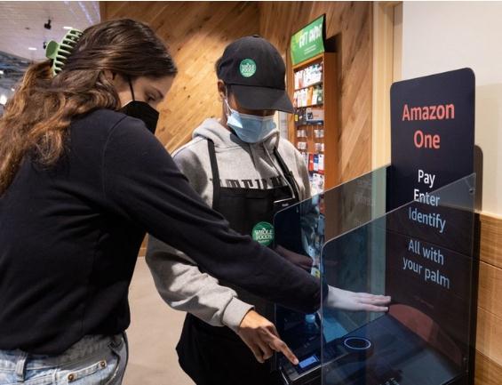 在這種模式里,進入超市時要先進行身份識別,顧客可以選擇掃描 Whole Foods Market 或亞馬遜應用程序中的店內代碼,在 Amazon One 上懸停手掌(Amazon One 使用包含專有計算機視覺算法的圖像掃描硬件來捕獲和加密手掌圖像),或插入與亞馬遜賬戶相關聯的信用卡或借記卡。