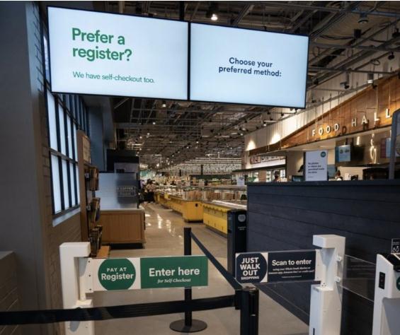 在華盛頓特區格洛弗公園附近的 Whole Foods Market 里,是亞馬遜在 2017 年以 137 億美元收購的雜貨連鎖超市。2022 年 2 月,亞馬遜在這家超市采用了無收銀員的「Just Walk Out Shopping」技術。
