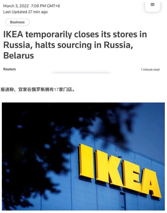 俄烏爆發沖突后,全球最大的家居品牌宜家3日發表聲明稱,將關閉其在俄羅斯的所有門店,并暫停從俄羅斯和白俄羅斯進貨。