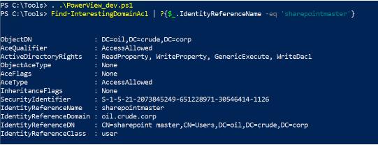 假設我們已經找到了對域對象具有 WriteDACL 權限的用戶的明文憑據。在我們的實驗室中,我們有一個名為 sharepointmaster 的用戶,他對域對象具有 WriteDACL 權限,如下面的屏幕截圖所示。