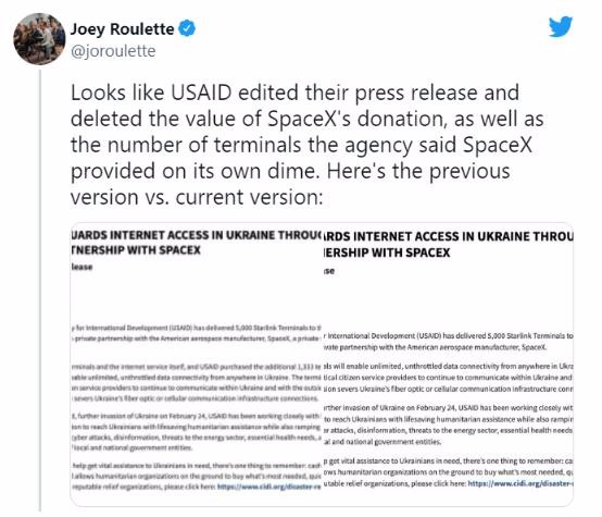 據記者 Joey Roulette 稱,SpaceX 向烏克蘭捐贈了 3667 個星鏈終端,價值約 1000 萬美元,其中還包括了與終端一起提供的三個月數據。然而,這筆捐款有可能部分得到了美國國際開發署 1500 美元 / 個采購的補貼。