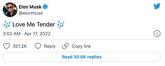 特斯拉 CEO 埃隆?馬斯克 (Elon Musk) 周末又讓投資者感到一頭霧水,他發(fā)布了一條帶有“投標(biāo)”(tender) 字樣的神秘推文,這很可能是在暗示他向 Twitter 股東發(fā)出的潛在要約收購,以獲得該公司控制權(quán)。