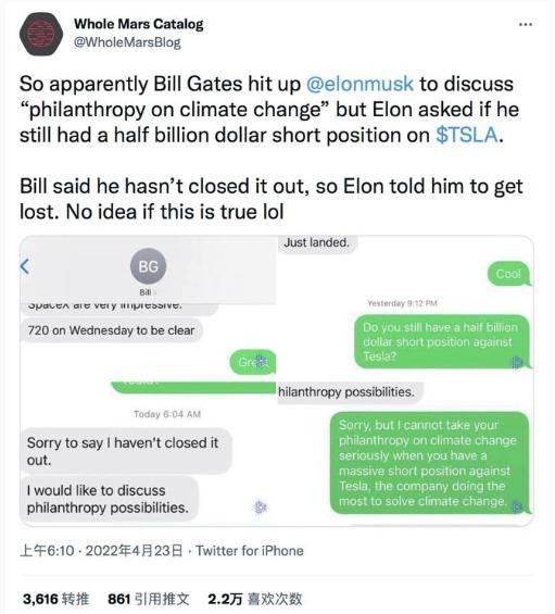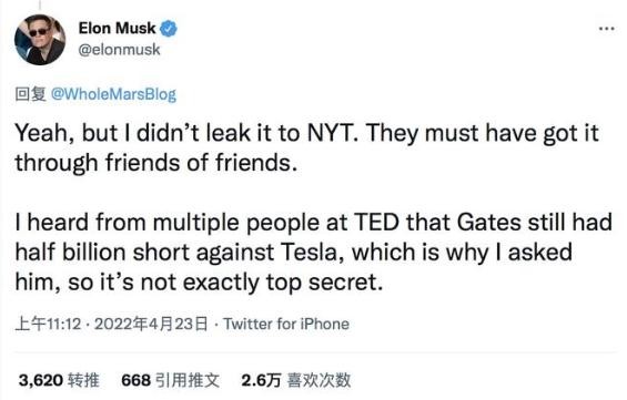 這一次是馬斯克直接在推文中承認,他曾私下“質問”蓋茨是不是做空了特斯拉股票。