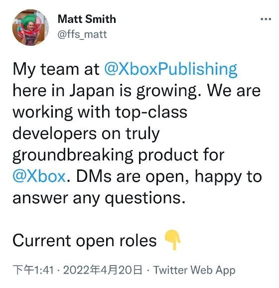 微軟 Xbox 發行主管 Matt Smith 近日在推特稱,其日本工作團隊正在和頂級開發商合作,但沒有透露具體是哪個。