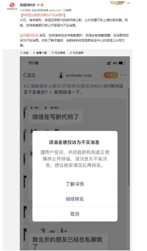 今日,有傳言稱,微信在寫新代碼做網(wǎng)絡(luò)分割,讓外地看不到上海的朋友圈。目前,該傳言截圖已被公開(kāi)辟謠為不實(shí)消息。