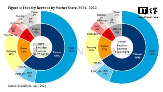 TrendForce 稱,“今年,包括臺積電、聯電和 PSMC 在內的中國臺灣代工企業的市場份額預計將從 64% 增加到 66%,而包括三星電子和 DB HiTek 在內的韓國公司的市場份額可能會從 18% 下降到 17%。”