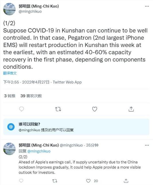 IT 之家 4 月 27 日消息,蘋果分析師郭明錤今日發推指出,假設昆山疫情形勢持續好轉,和碩昆山廠最早將于本周在重啟生產。根據零部件情況,預計和碩第一階段產能就可以恢復 40-60% 的水平。