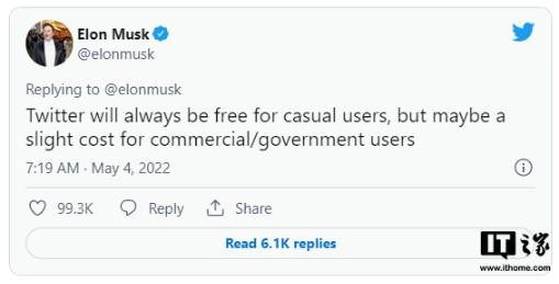 IT之家了解到,馬斯克說,推特將始終對“普通用戶”保持免費,但政府和商業用戶可能需要付出“輕微成本”。