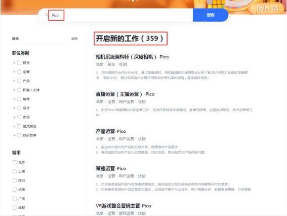 除了內部轉崗,委派自己人掌控大局,Pico 社交中心也在積極對外選賢舉能。在字節跳動的招聘官網上,Pico 目前開放的招聘崗位多達 359,囊括了服務端開發工程師、音視頻編碼高級工程師、VR 視頻體驗設計、Unity3D 架構師、圖像算法工程師、傳感器算法專家等各個崗位,分布地區包括北京、上海、深圳等。