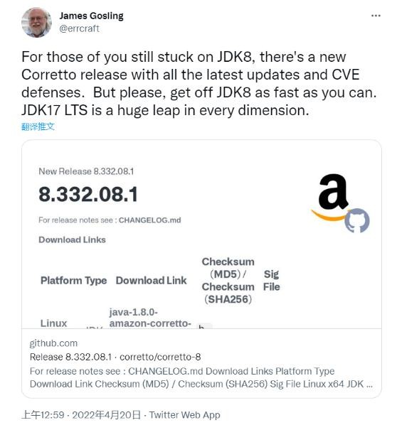 不過(guò)醉翁之意不在酒,原來(lái) Java 之父只是為了給東家 AWS 的 OpenJDK 發(fā)行版 Corretto “帶貨”,他建議仍在使用 JDK 8 的開(kāi)發(fā)者可以考慮使用 Corretto 的新版本——包含了所有最新的更新和 CVE 防御。Corretto 是亞馬遜推出的 OpenJDK 8 的發(fā)行版,它支持多種平臺(tái),可以在云端與本地計(jì)算機(jī)上運(yùn)行。每個(gè) Corretto 版本上都會(huì)運(yùn)行技術(shù)兼容性工具包(Technology Compatibility Kit,TCK),以確保與 Java SE 平臺(tái)相兼容。在不使用到 OpenJDK 中沒(méi)有的功能(例如 Java Flight Recorder)的情況下,Corretto 完全可以直接作為 Java SE 發(fā)行版的替代品。