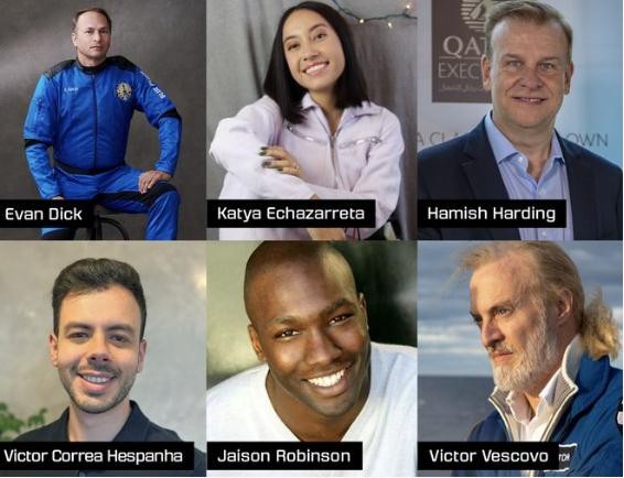 本次飛行也是新謝潑德亞軌道飛行器的第 21 次任務,6 名乘客分別是投資人和 NS-19 亞軌道旅行乘客埃文·迪克(Evan Dick)、電氣工程師和 NASA 前測試負責人卡蒂亞·埃查扎雷塔(Katya Echazarreta)、公務機飛行員哈米什·哈丁(Hamish Harding)、28 歲土建工程師維克托·科雷亞·赫斯帕尼亞(Victor Correa Hespanha)、創辦了商業地產公司的冒險家賈森·羅賓遜(Jaison Robinson)、私募股權公司聯合創始人維克托·維斯科沃(Victor Vescovo)。