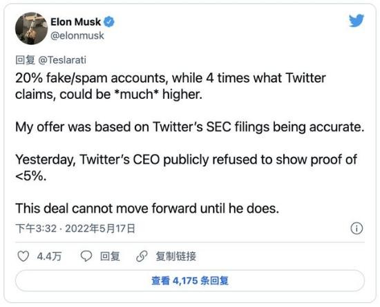特斯拉 CEO 馬斯克稱,除非推特證明虛假賬戶少于5%,否則交易無法推進。