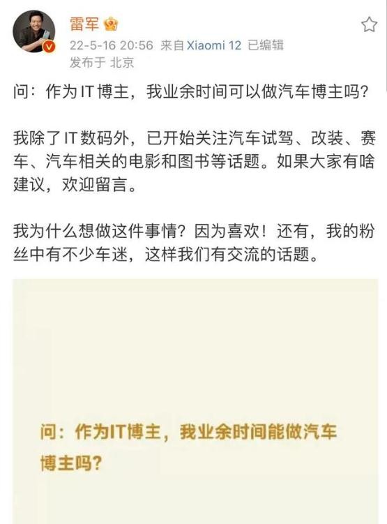 小米創始人、董事長兼 CEO@雷軍在個人社交賬號發文稱,自己除了做 IT 博主之外,還準備業余時間做一個汽車博主。并稱他目前已開始關注汽車試駕、改裝、賽車、汽車相關的電影和圖書等話題。