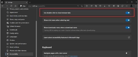 IT之家了解到,該功能默認情況下是禁用的,因此需要導航到 Edge 設置 > 輔助功能并打開“使用雙擊關閉瀏覽器標簽頁”選項。然后,用鼠標左鍵雙擊一個標簽頁,就可以將其關閉。
