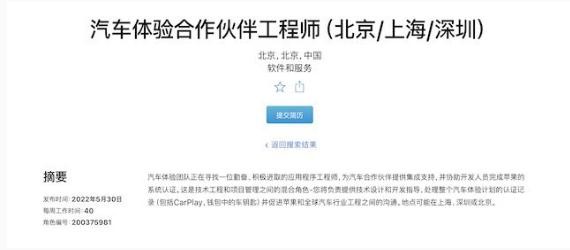 蘋果官網信息顯示,近期蘋果正在北京、上海、深圳三地招聘汽車體驗合作伙伴工程師。根據其職位描述,該崗位需要為汽車合作伙伴提供集成支持,并協助開發人員完成蘋果的系統認證。