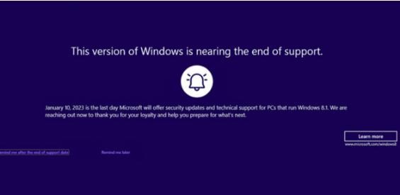 據相關用戶反饋,已經收到微軟推送的彈窗警告,提醒官方對 Windows 8.1 系統的安全補丁和技術支持將在 2023 年 1 月 10 日結束。微軟給了用戶三個選擇,可以選擇了解更多信息、稍后提醒或在結束支持時提醒。
