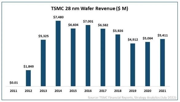 據 Strategy Analytics 機構報告,在經歷了十年后,臺積電 28nm 芯片仍擁有可觀的收益。臺積電、聯華電子和中芯國際正在進一步擴大 28nm 產能。2021 年,28nm 晶圓代工總營收超過 72 億美元(約 486.72 億元人民幣),臺積電占約四分之三的營收份額。