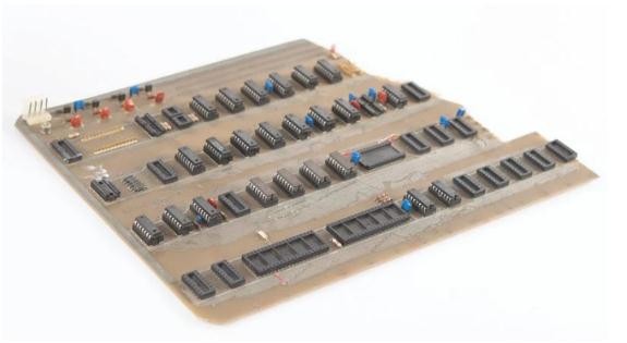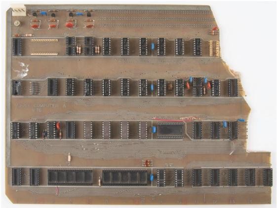 這塊在 1976 年由史蒂夫-沃茲尼亞克手工焊接的 Apple Computer A 印刷電路板被史蒂夫-喬布斯用來向保羅-特雷爾演示 Apple-1 電腦,后者是加州山景城 The Byte Shop 的老板。特雷爾之后訂購了 50 臺完全組裝好的機器并以每臺 666.66 美元(約 4506.62 元人民幣)的價格出售,The Byte Shop 成為了 Apple-1 電腦的第一個零售商。