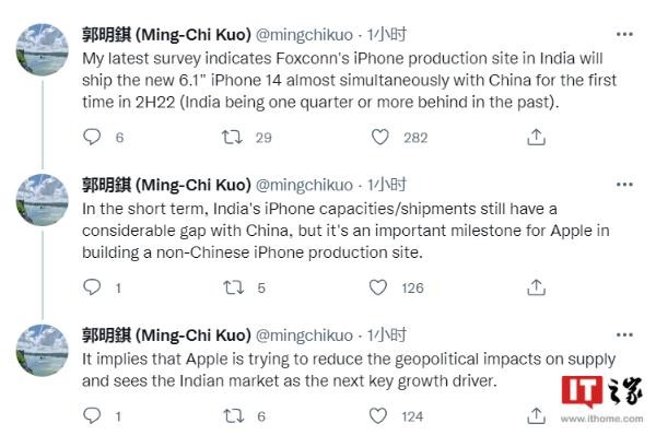 郭明錤稱,從短期來看,印度的 iPhone 產能 / 出貨量與中國仍有相當大的差距,但對于蘋果在中國以外的地區建設 iPhone 生產基地來說,這是一個重要的里程碑,意味著蘋果將印度市場視為下一個關鍵增長動力。