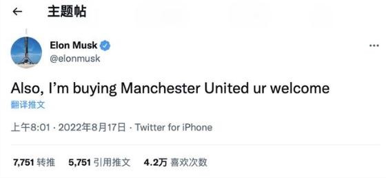 最近曼聯的流量實在太大,連特斯拉 CEO 馬斯克也橫插一腳。8 月 17 日,特斯拉 CEO 馬斯克在推特發文稱,將收購英超俱樂部曼聯。