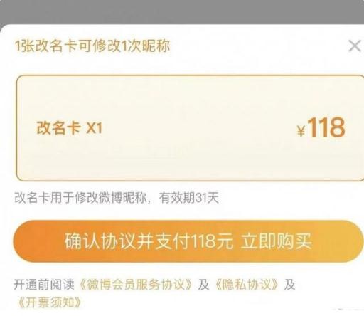 昨日晚間有大量網友發現微博新推出了改名卡服務,該卡售價 118 元一張,有效期 31 天,一張改名卡可修改昵稱一次。但現在微博已經宣布下架改名卡服務,并稱功能上存在問題。