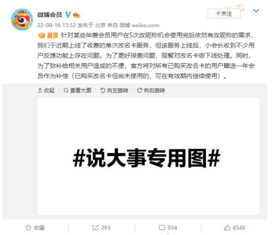 官方還表示,為了彌補給相關用戶帶來的不便,將對所有已購買改名卡的用戶贈送一年微博會員作為補償,同時已購買但尚未使用的改名卡,可以在有效期內繼續使用。