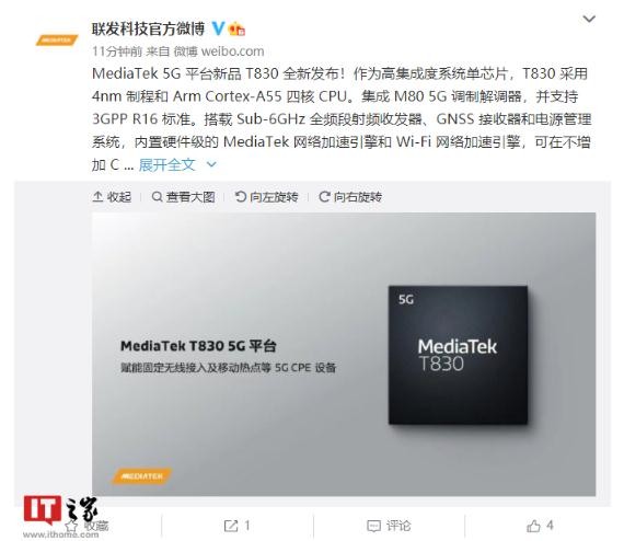 聯發科今天宣布,MediaTek 5G 平臺新品 T830 全新發布。作為高集成度系統單芯片,T830 采用 4nm 制程和 Arm Cortex-A55 四核 CPU。集成 M80 5G 調制解調器,并支持 3GPP R16 標準。
