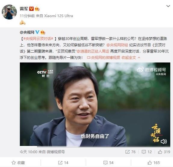 繼俞敏洪后,央視網財經紀實訪談節(jié)目《云頂對話》迎來第二期,此次的主角是小米董事長雷軍。